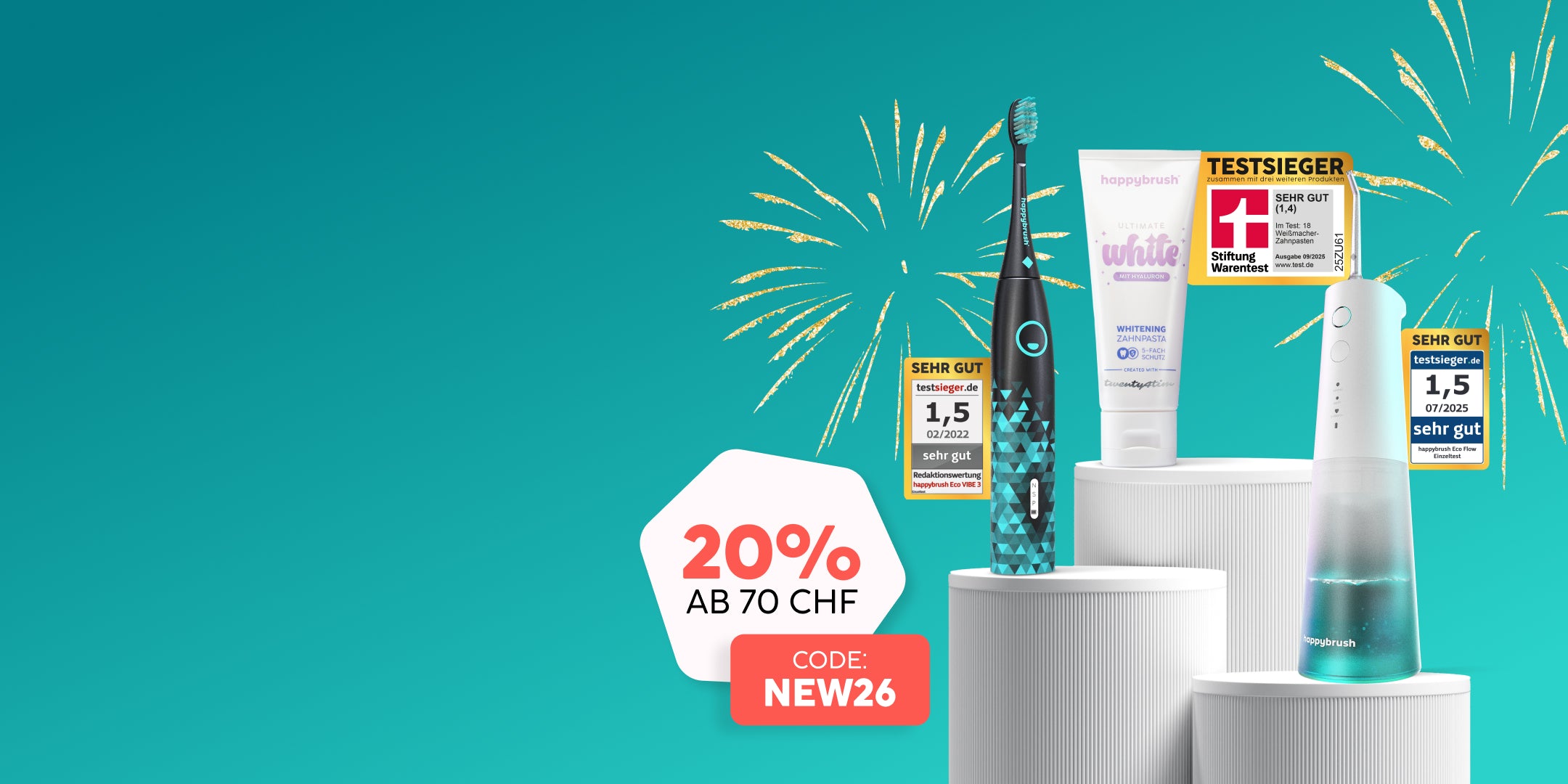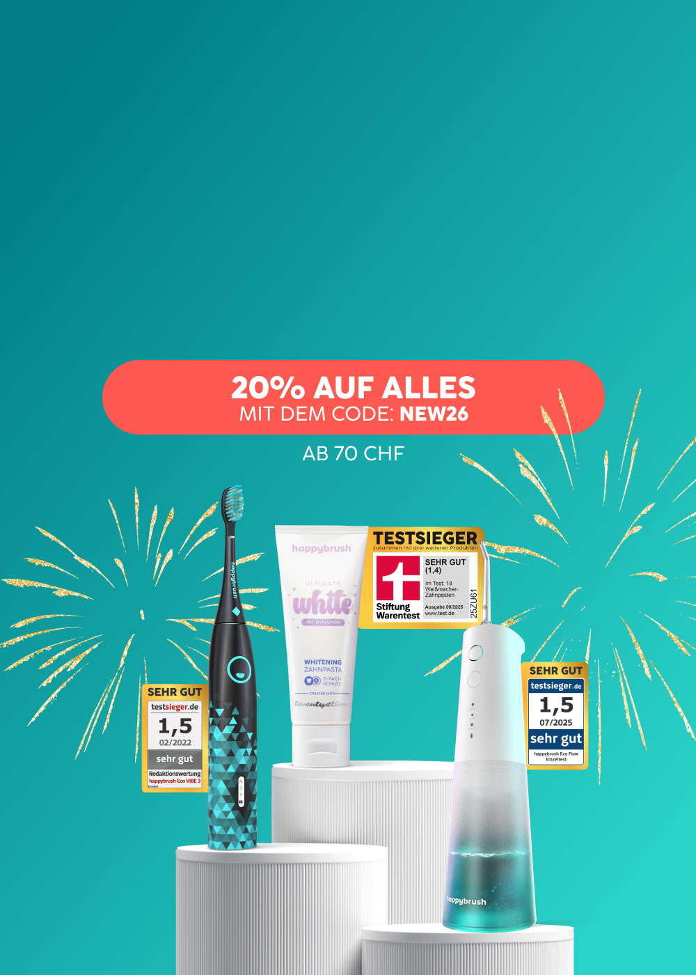 Sichere dir jetzt 20 % Rabatt ab 70 CHF auf elektrische Zahnbürsten, Mundduschen & mehr. Perfekt für ein frisches Upgrade deiner Pflegeroutine zum Jahresstart. Let’s glow!